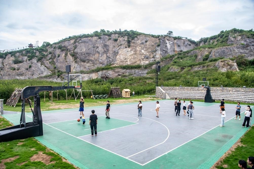 8月16日,在重慶市北碚區(qū)靜觀鎮(zhèn)中華村,游客在礦坑修復改造的運動場內(nèi)打球。新華社記者 唐奕 攝