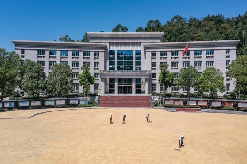 8月20日,人們在重慶市永川區(qū)紅爐鎮(zhèn)政府廣場上晾曬糧食(無人機照片)。