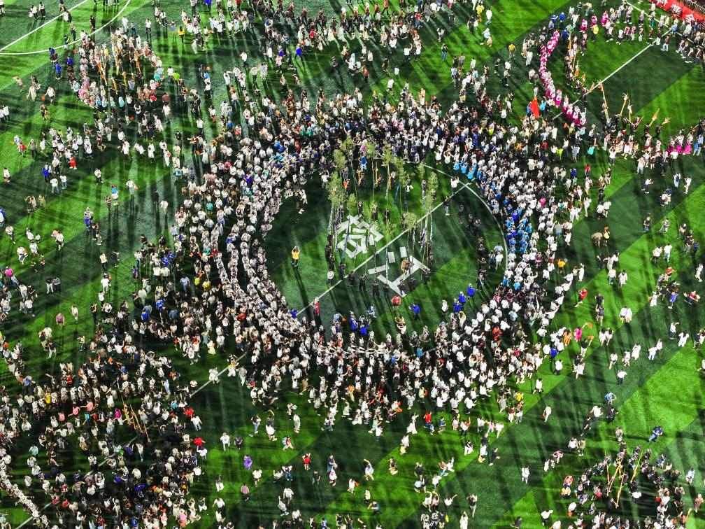 8月23日,人們?cè)谫F州“村超”球場(chǎng)跳苗族蘆笙舞(無人機(jī)照片)。新華社記者 楊文斌 攝