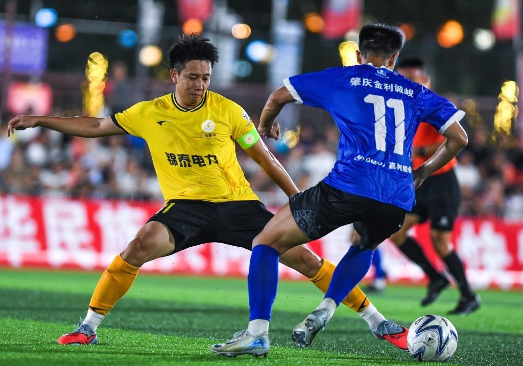 8月23日,廣東和平商會(huì)足球隊(duì)球員陳宇(左)與廣東肇慶金利誠(chéng)峻足球隊(duì)球員陳開樂在比賽中。新華社記者 楊文斌 攝