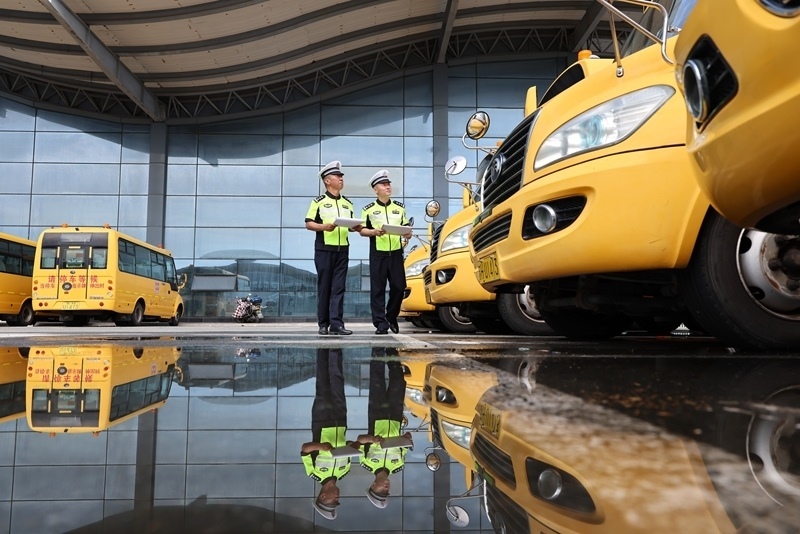 8月25日,湖北省襄陽市保康縣公安局交警大隊(duì)民警對(duì)校車進(jìn)行安全檢查(無人機(jī)照片)。