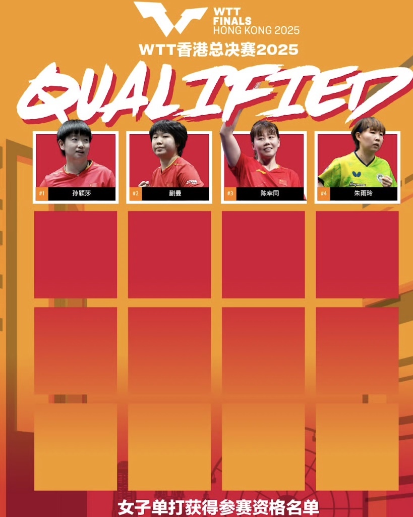 中國(guó)隊(duì)孫穎莎、蒯曼、陳幸同及中國(guó)澳門隊(duì)的朱雨玲獲得WTT香港總決賽女子單打參賽資格。圖片來(lái)自WTT世界乒聯(lián)官方微博
