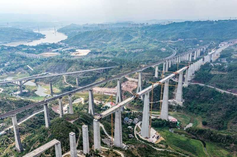 蔡家溝雙線(xiàn)特大橋位于重慶市涪陵區(qū),橫跨長(zhǎng)江支流,是全線(xiàn)重難點(diǎn)工程。大橋主跨采用連續(xù)剛構(gòu)設(shè)計(jì),整體呈“兩端短、中間長(zhǎng)”的對(duì)稱(chēng)結(jié)構(gòu),總跨度達(dá)584米。