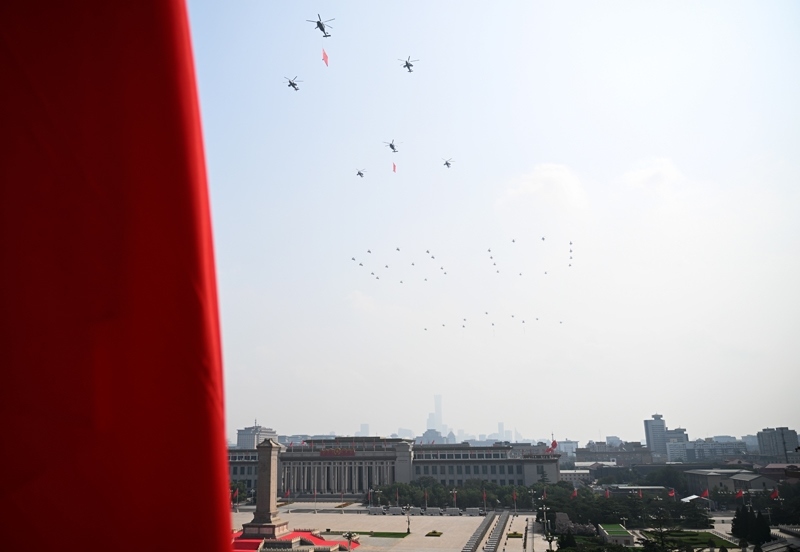 9月3日,紀念中國人民抗日戰(zhàn)爭暨世界反法西斯戰(zhàn)爭勝利80周年大會在北京隆重舉行。這是空中護旗梯隊。