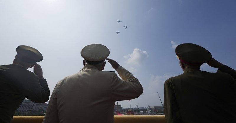 9月3日,紀念中國人民抗日戰(zhàn)爭暨世界反法西斯戰(zhàn)爭勝利80周年大會在北京隆重舉行。這是轟炸機梯隊飛過天安門廣場上空時嘉賓敬禮。
