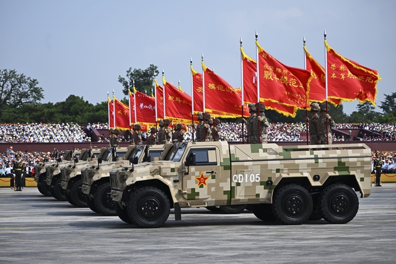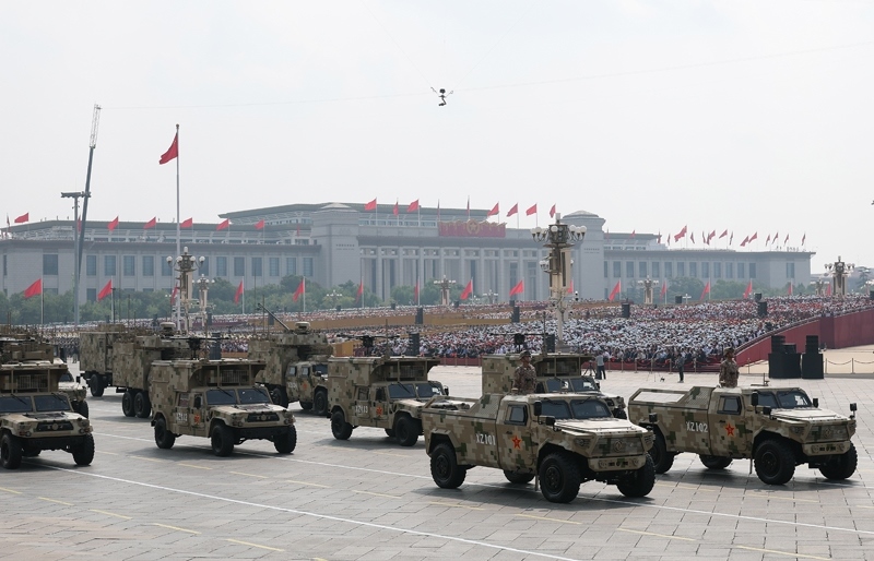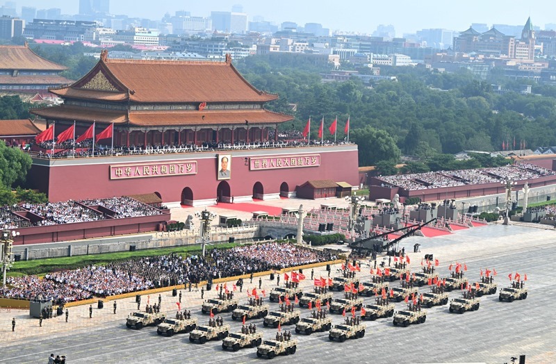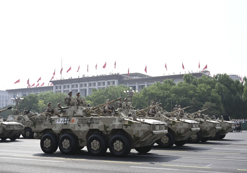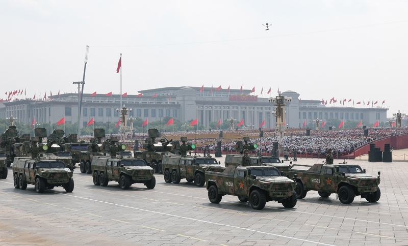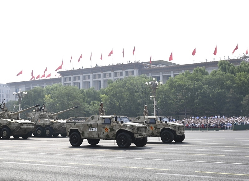 9月3日,紀(jì)念中國人民抗日戰(zhàn)爭暨世界反法西斯戰(zhàn)爭勝利80周年大會在北京隆重舉行。這是信息支援方隊通過天安門廣場。