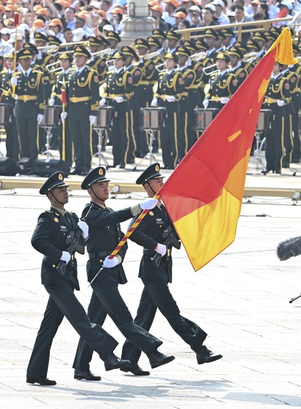 9月3日,紀(jì)念中國人民抗日戰(zhàn)爭暨世界反法西斯戰(zhàn)爭勝利80周年大會在北京隆重舉行。這是國旗護(hù)衛(wèi)隊在天安門廣場列隊。