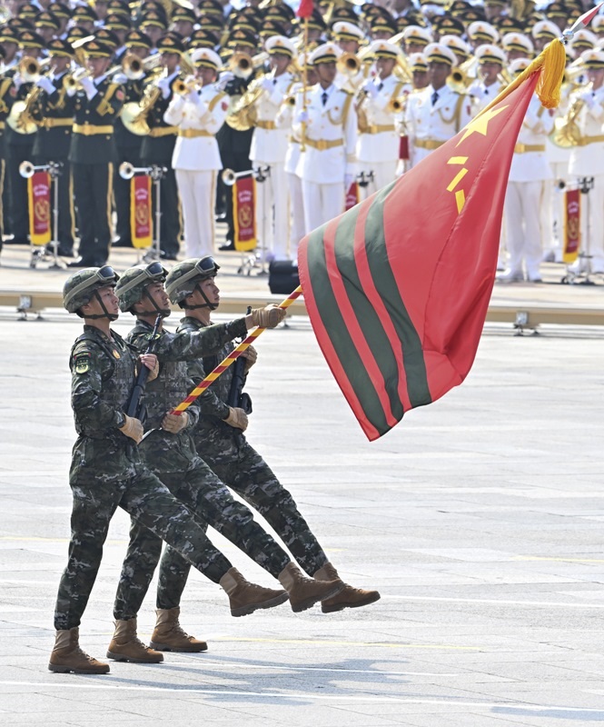 9月3日,紀(jì)念中國人民抗日戰(zhàn)爭暨世界反法西斯戰(zhàn)爭勝利80周年大會在北京隆重舉行。這是戰(zhàn)旗方隊接受檢閱。