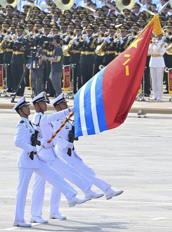 9月3日,紀(jì)念中國人民抗日戰(zhàn)爭暨世界反法西斯戰(zhàn)爭勝利80周年大會在北京隆重舉行。這是海軍方隊通過天安門廣場。