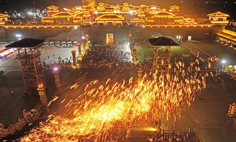 10月3日晚,游客在山東省臨沂市郯城縣郯國古城景區(qū)觀看打鐵花(無人機(jī)照片)。