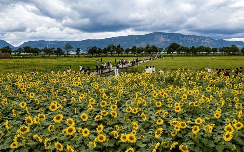 10月4日,游客在昆明滇池邊的福保村欣賞向日葵(無人機(jī)照片)。