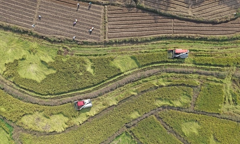10月17日,在浙江省臺(tái)州市仙居縣雙廟鄉(xiāng),農(nóng)機(jī)手駕駛農(nóng)機(jī)收割晚稻(無人機(jī)照片)。