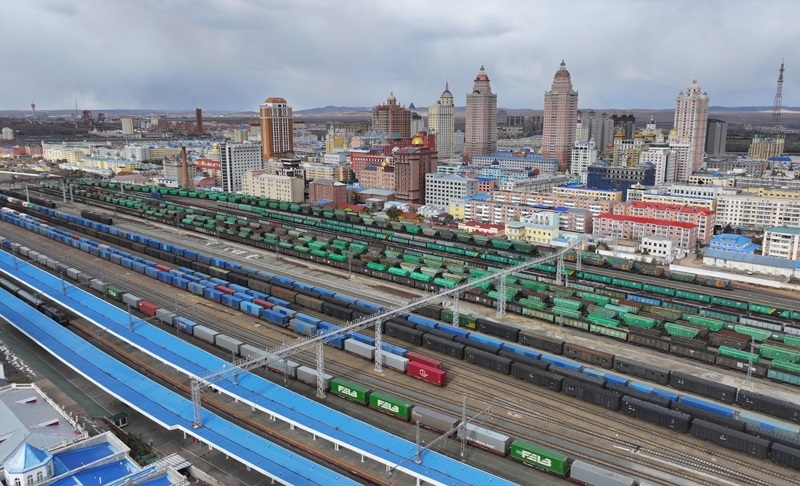 10月18日,一列滿載進口物資的貨物列車駛向中國鐵路哈爾濱局集團有限公司綏芬河站(無人機照片)。
