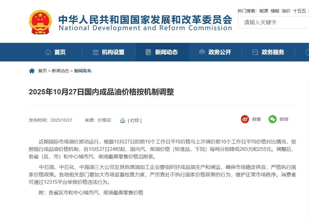 中國(guó)網(wǎng)10月27日訊 據(jù)國(guó)家發(fā)改委網(wǎng)站消息,近期國(guó)際市場(chǎng)油價(jià)波動(dòng)運(yùn)行,根據(jù)10月27日的前10個(gè)工作日平均價(jià)格與上次調(diào)價(jià)前10個(gè)工作日平均價(jià)格對(duì)比情況,按照現(xiàn)行成品油價(jià)格機(jī)制,自10月27日24時(shí)起,國(guó)內(nèi)汽、柴油價(jià)格(標(biāo)準(zhǔn)品,下同)每噸分別降低265元和255元。調(diào)整后,各省(區(qū)、市)和中心城市汽、柴油最高零售價(jià)格見(jiàn)附表。