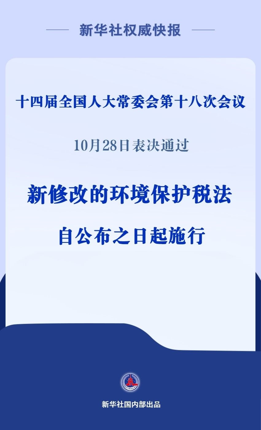 十四屆全國人大常委會(huì)第十八次會(huì)議10月28日表決通過關(guān)于修改環(huán)境保護(hù)稅法的決定,并自公布之日起施行。