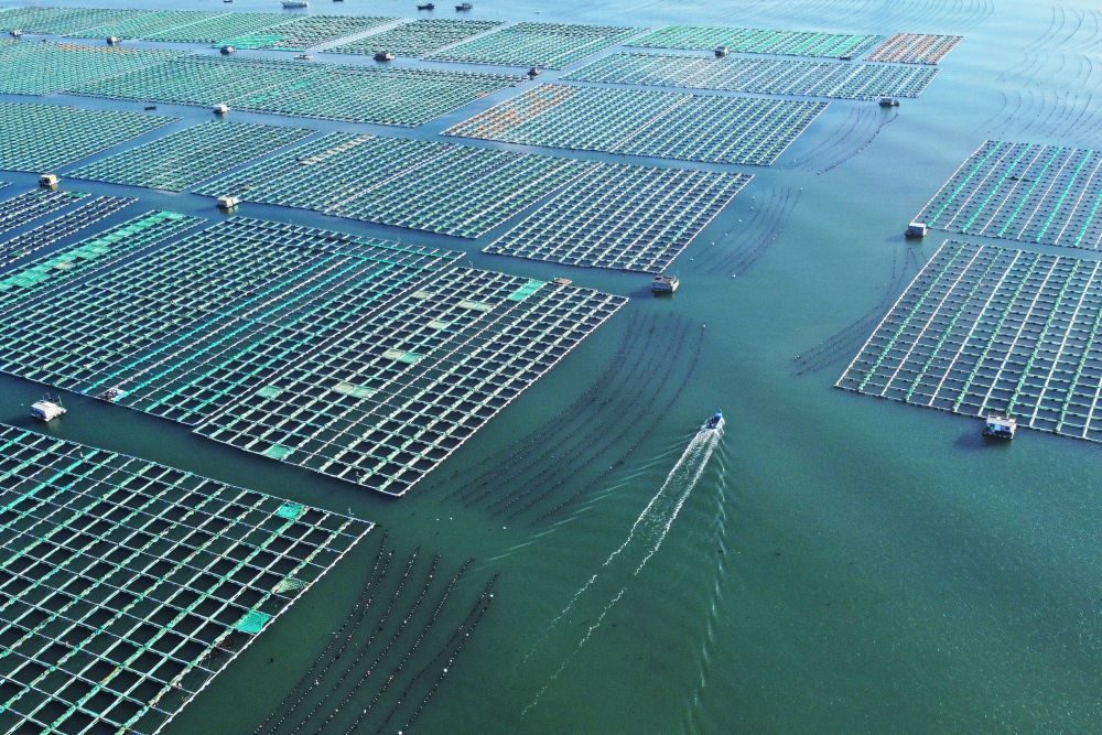 ↑ 11月10日,在山東省榮成市桑溝灣海洋牧場(chǎng),養(yǎng)殖工人在養(yǎng)殖區(qū)穿梭作業(yè)(無(wú)人機(jī)照片)。新華社發(fā)(王福東 攝)