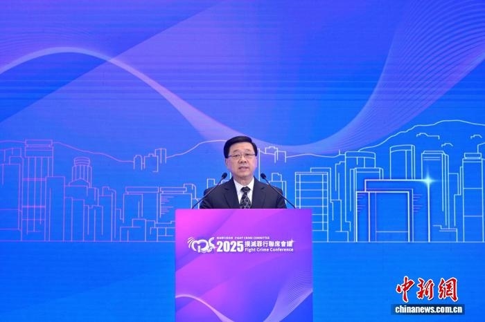 圖為香港特區(qū)行政長(zhǎng)官李家超在“2025撲滅罪行聯(lián)席會(huì)議”上致辭。 (香港特區(qū)政府新聞處供圖)
