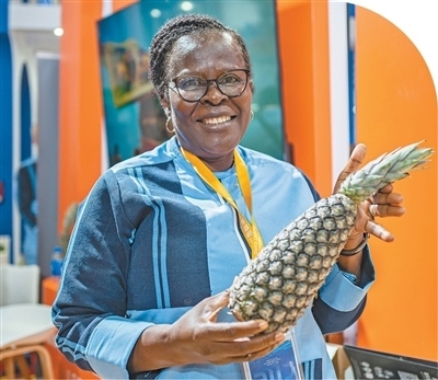 在第八屆進博會國家綜合展上,貝寧國家館的工作人員展示貝寧奶油菠蘿。