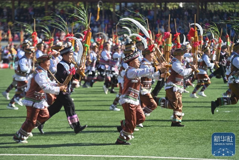 ↑11月29日,表演者在融水縣民族體育公園舉行的蘆笙斗馬節(jié)開(kāi)幕式現(xiàn)場(chǎng)表演。新華社記者 黃孝邦 攝