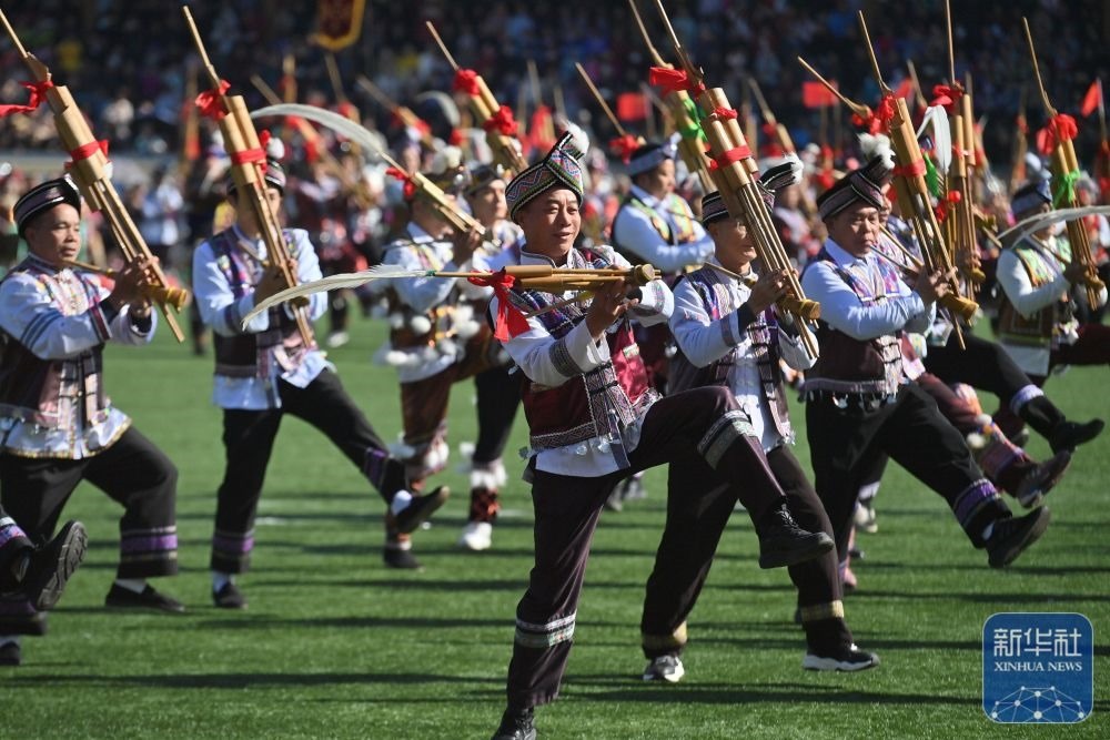 ↑11月29日,表演者在融水縣民族體育公園舉行的蘆笙斗馬節(jié)開(kāi)幕式現(xiàn)場(chǎng)吹奏蘆笙。新華社記者 黃孝邦 攝