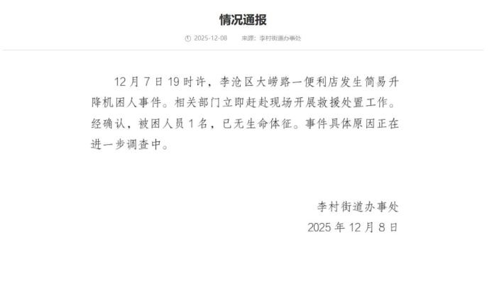 中新網(wǎng)12月8日電 青島李村街道辦事處8日在青島李滄政務(wù)網(wǎng)發(fā)布情況通報(bào)稱,12月7日19時(shí)許,李滄區(qū)大嶗路一便利店發(fā)生簡(jiǎn)易升降機(jī)困人事件。相關(guān)部門立即趕赴現(xiàn)場(chǎng)開(kāi)展救援處置工作。經(jīng)確認(rèn),被困人員1名,已無(wú)生命體征。事件具體原因正在進(jìn)一步調(diào)查中。