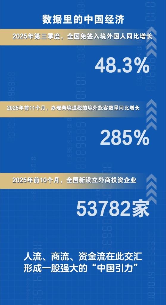 新華社上海12月26日電(記者王默玲、周蕊、桑彤)免簽政策持續(xù)擴(kuò)容,“中國游”熱潮席卷全球;離境退稅便捷高效,“中國購”熱度持續(xù)攀升;外資企業(yè)加速布局,“投資中國”信心堅(jiān)定。2025年,人流、商流、資金流在此交匯,形成一股強(qiáng)大的“中國引力”。