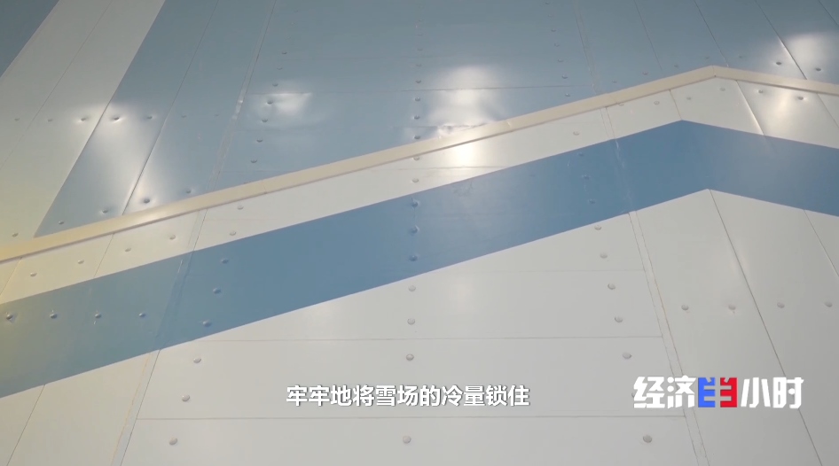 工作人員介紹,雪場(chǎng)四周和樓頂分布著1萬(wàn)多塊冷庫(kù)板,牢牢將雪場(chǎng)冷量鎖住,隔絕內(nèi)外之間溫差。
