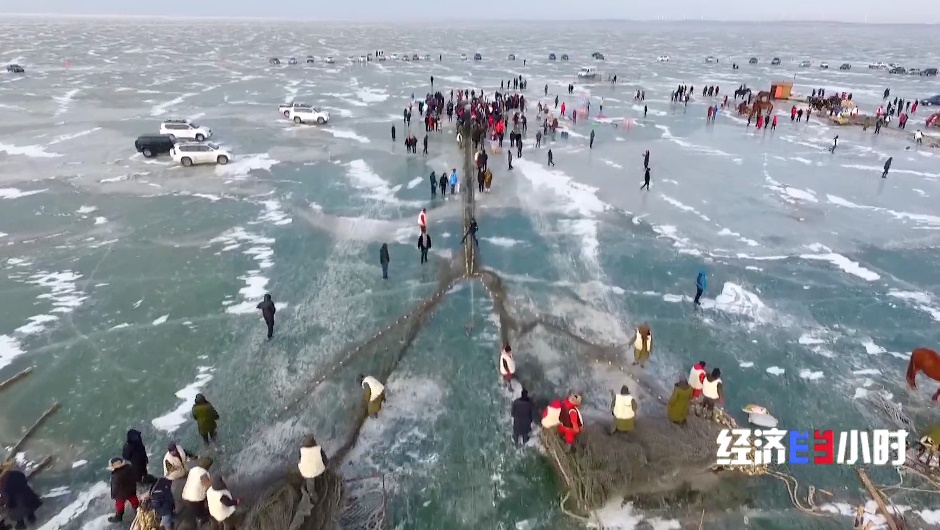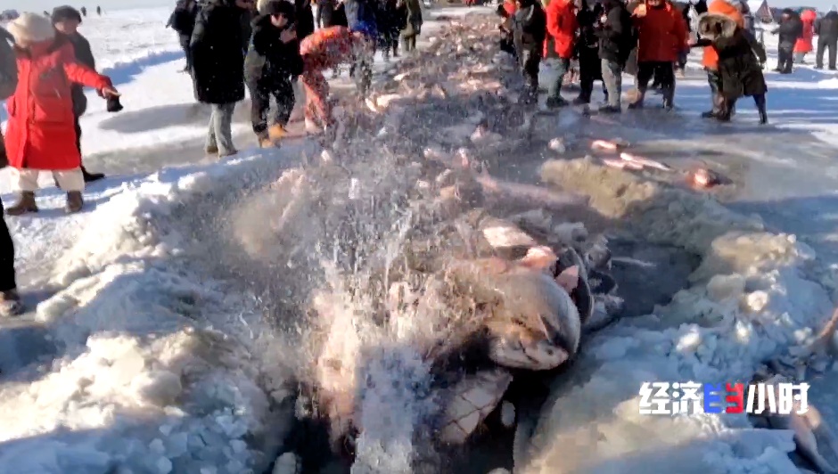 為了吸引游客,查干湖還推出私人訂制捕魚(yú)、冰下盲盒等新項(xiàng)目。100米長(zhǎng)的掛網(wǎng),游客組隊(duì)拉拽,親手捕魚(yú)后,可以直接送進(jìn)后廚做成鐵鍋燉。