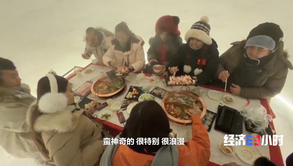 游客們?cè)诒煅┑乩锲弦怀?,一上岸,就奔向特色雪屋。在這里享用熱氣騰騰的火鍋,體驗(yàn)“冰火兩重天”的樂(lè)趣。