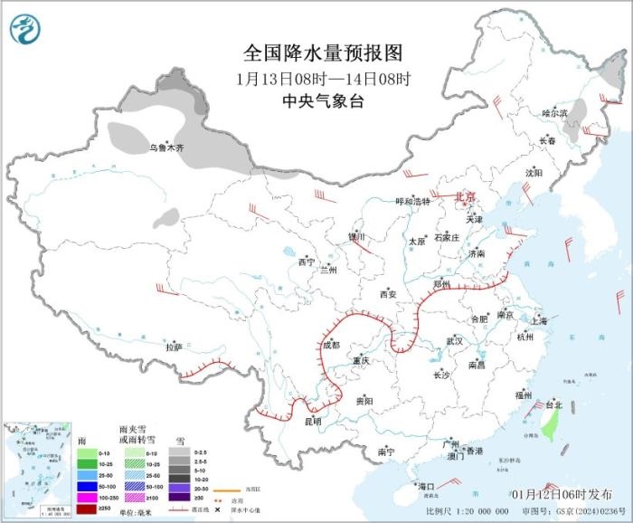 圖2 全國(guó)降水量預(yù)報(bào)圖(1月12日08時(shí)-13日08時(shí))。圖片來源:中央氣象臺(tái)網(wǎng)站