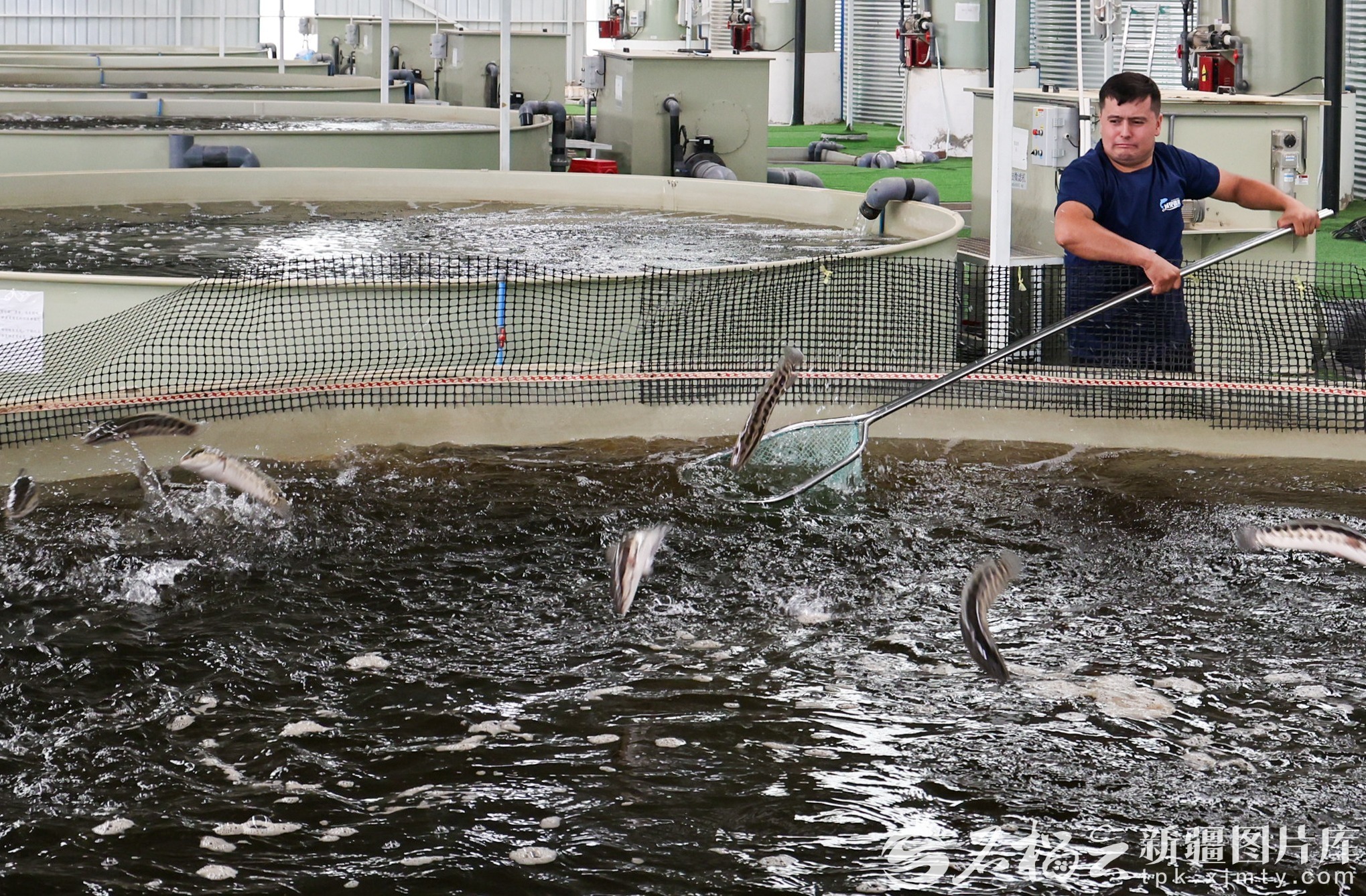 和田域見疆來水產(chǎn)養(yǎng)殖有限責任公司員工在對養(yǎng)殖池的黑魚進行捕撈。許曉龍攝(資料圖)