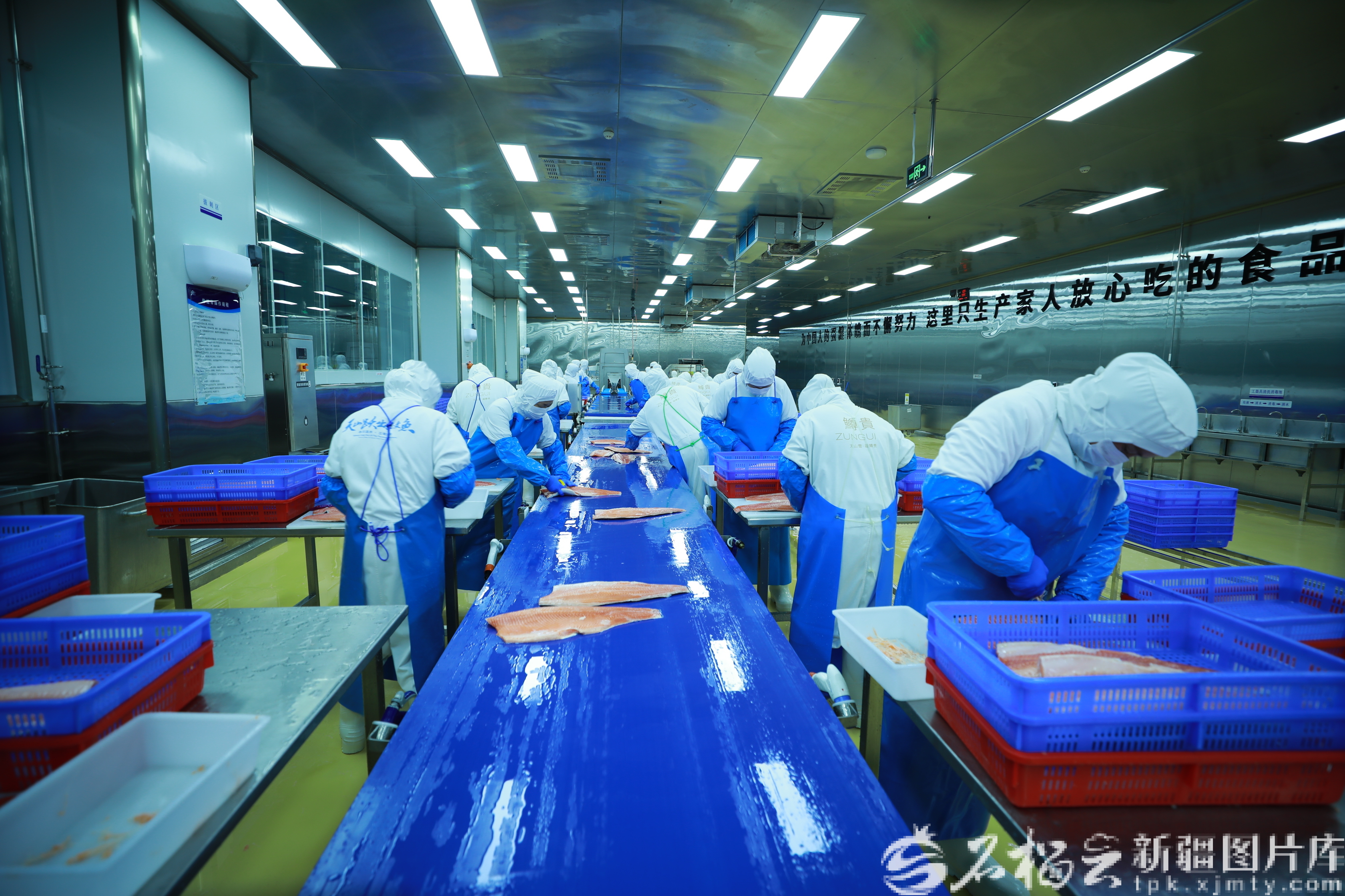 新疆天蘊有機農(nóng)業(yè)有限公司三文魚深加工廠,工人在加工三文魚。趙學林攝(資料圖)