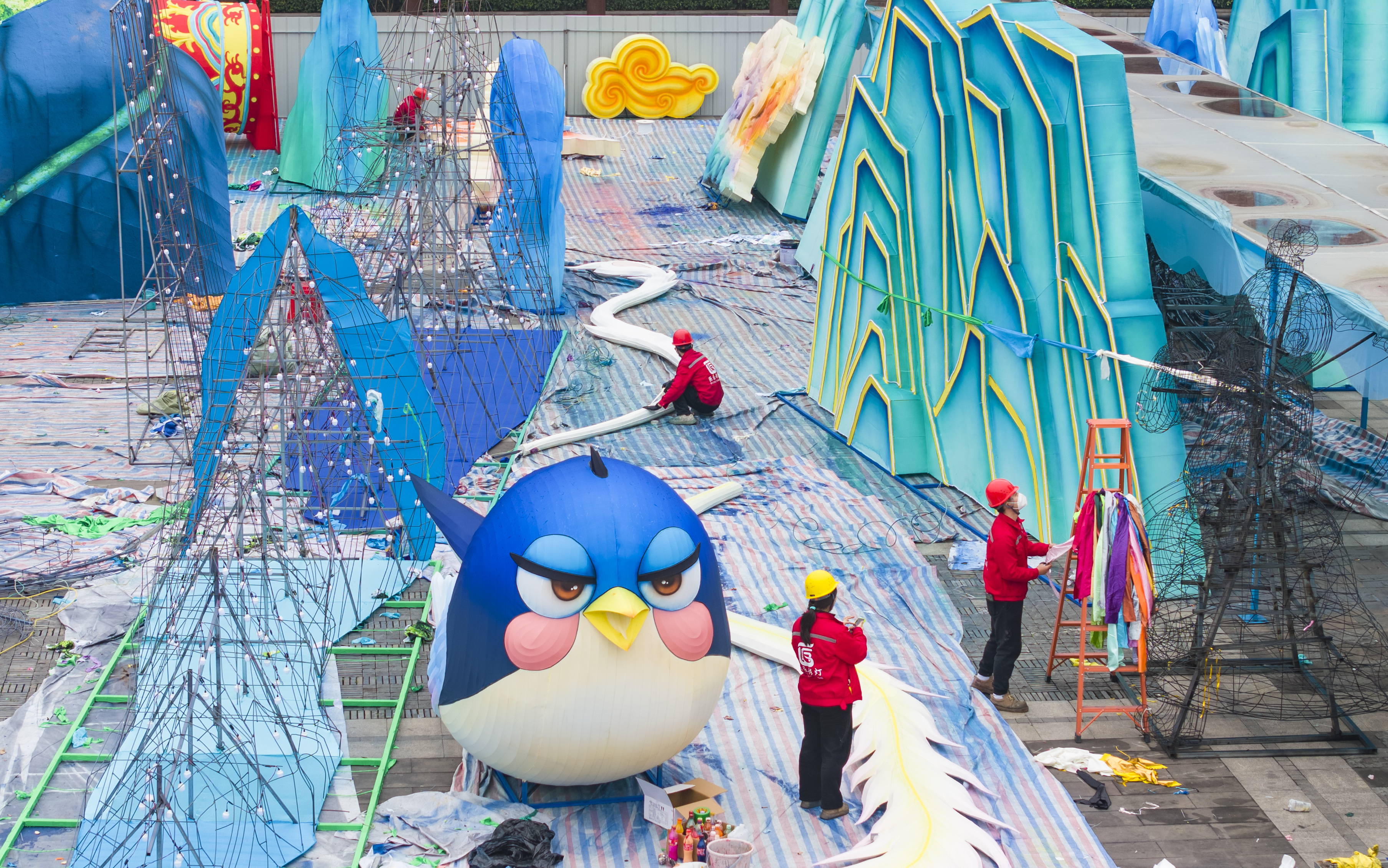 1月23日晚,自貢中華彩燈大世界火樹銀花。流光溢彩的燈海盛景,拉開了第32屆自貢國(guó)際恐龍燈會(huì)亮燈暨四川省迎春文旅促消費(fèi)活動(dòng)的序幕。在200多公里外的重慶園博園龍景湖畔,焊槍滋滋作響,火星如流星濺落。自貢彩燈匠人王東瞇著眼,用鉗子彎折著一根根鐵絲,在他身后,一尊高達(dá)15米、寬約40米的《巾幗良玉》燈組巍然屹立,一臺(tái)西部最大的水上燈會(huì)正在緊鑼密鼓籌備之中。