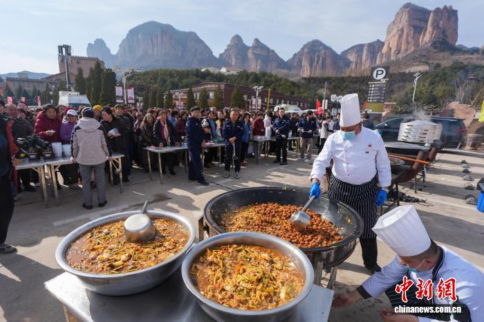 除了非遺展區(qū),在場地一側安排的“千人百桌宴”也提前烘托出濃濃年味。偌大的場地內,10人一桌的圓桌分4列排開,近千人同時用餐,“大燴菜、開花饃,廚師現場制作的飯菜熱氣騰騰,胃口一下就打開了”。