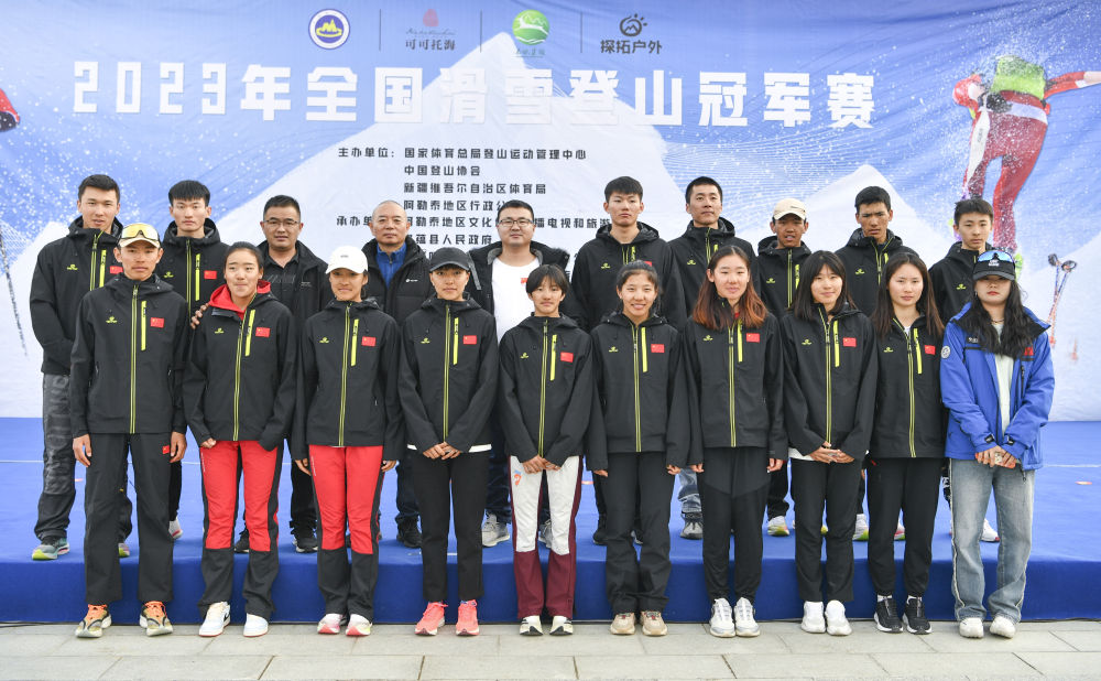 這是在首屆全國滑雪登山冠軍賽期間拍攝的布魯爾(前排左一)、次旦玉珍(前排左五)和國家集訓隊合影(2023年4月7日攝)。新華社記者 胡虎虎 攝