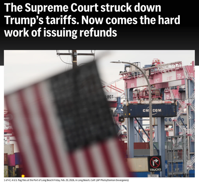 △美聯(lián)社報道,最高法院駁回特朗普的關(guān)稅政策后,艱巨的退還稅款任務(wù)開始了