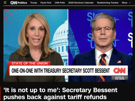 當(dāng)?shù)貢r間2月22日,美國財政部長斯科特·貝森特在接受美國有線電視新聞網(wǎng)(CNN)采訪時,被主持人達(dá)娜·巴什追問著一個看似直接、卻難以直接回答的問題:既然最高法院已裁定特朗普政府依據(jù)《國際緊急經(jīng)濟(jì)權(quán)力法》(IEEPA)征收的大范圍“緊急關(guān)稅”缺乏授權(quán),那么此前收上來的巨額關(guān)稅款,退不退、怎么退?