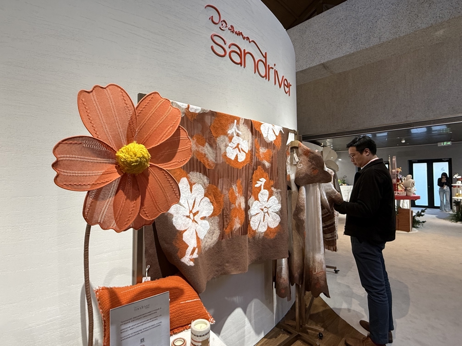 “踏花影”區(qū)域是一個五感體驗的沉浸空間。藝術(shù)羊絨品牌Sandriver沙涓現(xiàn)場還原了日喀則羊絨氆氌工坊、果洛牦牛絨氆氌工坊的織機(jī)操作,匠人以雙手穿梭,在經(jīng)緯交錯間演繹“高原的溫度”,消費(fèi)者能近距離觀看從捻紗到成胚的全過程,感受這一非物質(zhì)文化遺產(chǎn)的匠心精神。沙涓品牌負(fù)責(zé)人介紹,品牌將首發(fā)羊絨睡袍系列新品、馬年主題哈尼繡系列以及羊絨艾德萊斯家居毯等作品,展現(xiàn)傳統(tǒng)工藝與當(dāng)代生活美學(xué)融合的羊絨設(shè)計。