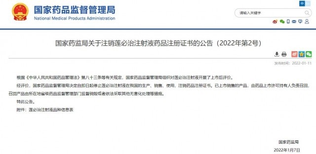 據(jù)國(guó)家藥監(jiān)局網(wǎng)站消息,國(guó)家藥品監(jiān)督管理局11日發(fā)布公告,決定自即日起停止蓮必治注射液在我國(guó)的生產(chǎn)、銷售、使用,注銷藥品注冊(cè)證書(shū)。已上市銷售的產(chǎn)品,由藥品上市許可持有人負(fù)責(zé)召回,召回產(chǎn)品由所在地省級(jí)藥品監(jiān)督管理部門監(jiān)督銷毀或者依法采取其他無(wú)害化處理等措施。