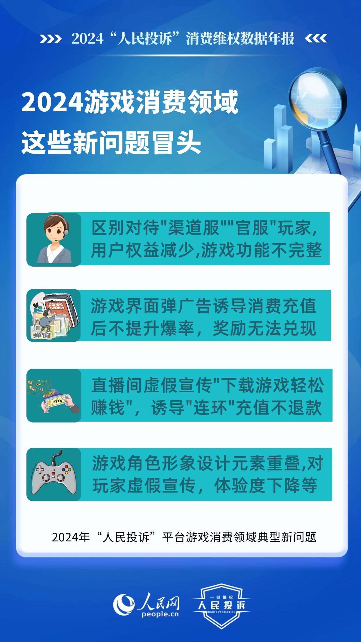 在游戲類,老問題主要有:未成年人網(wǎng)游消費(fèi)不規(guī)范,平臺以“免費(fèi)”“紅包”誘導(dǎo)點(diǎn)擊充值,未身份驗證、支付環(huán)節(jié)無提示,提交證據(jù)申請退款遭拒或退款金額不合理;虛假宣傳游戲內(nèi)容誘導(dǎo)充值點(diǎn)券,玩家實(shí)際回報/游戲體驗與預(yù)期不符;無故封號、游戲裝備丟失、賬號被盜、系統(tǒng)漏洞導(dǎo)致玩家利益受損,客服不回應(yīng)、平臺不理;系統(tǒng)漏洞、卡頓閃退、匹配機(jī)制失衡等網(wǎng)游體驗差等。
