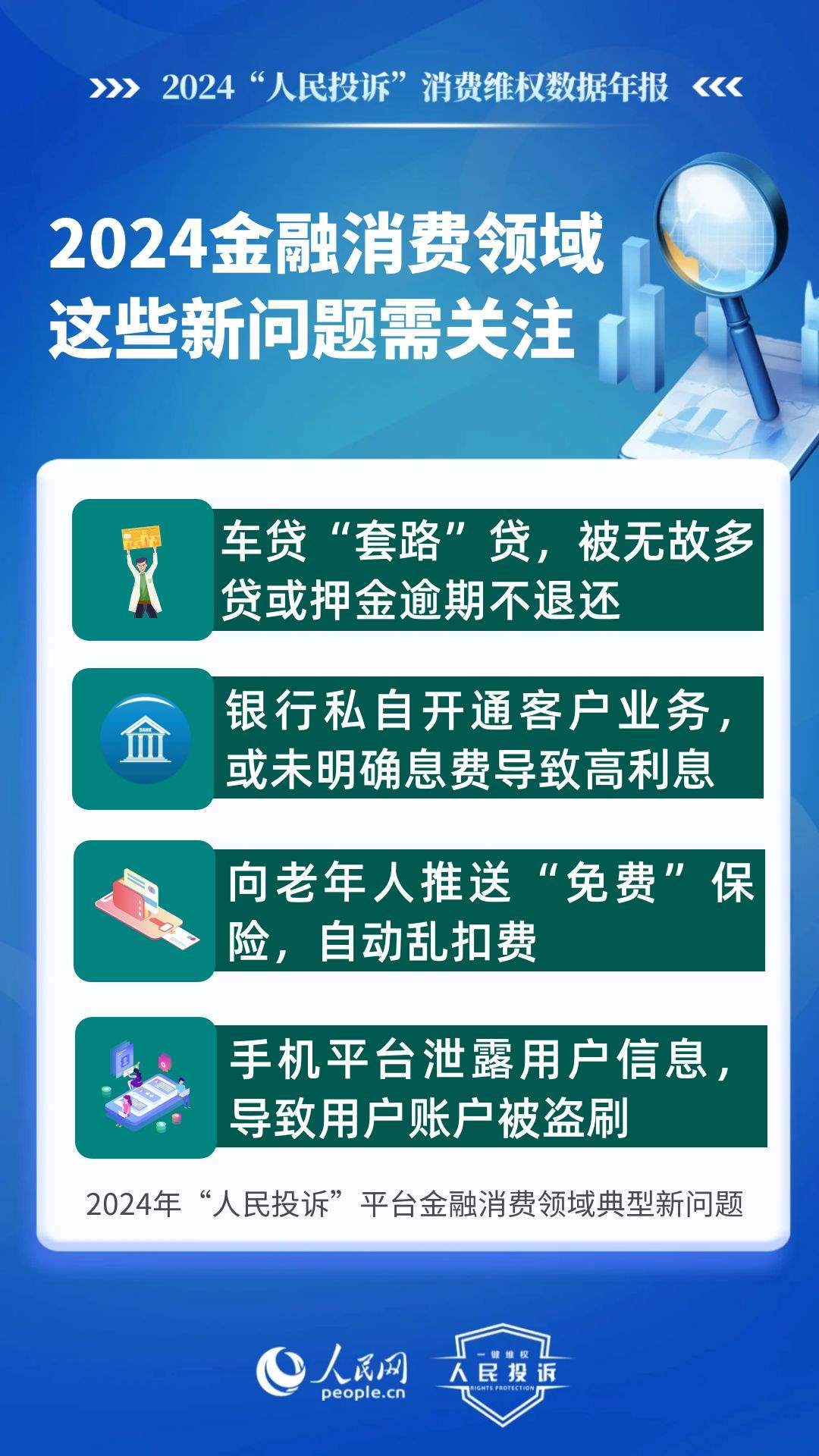 新問題體現(xiàn)在:車貸“套路”貸,被無故多貸或押金逾期不退還;銀行私自開通客戶銀行卡業(yè)務(wù),或未向客戶明確息費(fèi)導(dǎo)致高額利息;小程序誘導(dǎo)充值后提現(xiàn)欺詐;支付平臺向老年人推送“免費(fèi)”保險,自動亂扣費(fèi);手機(jī)平臺泄露用戶信息,導(dǎo)致用戶賬戶被盜刷、微信錢包被自動扣款等;跨境電商運(yùn)營App誘導(dǎo)高額充值后無法提現(xiàn)、不退款等。