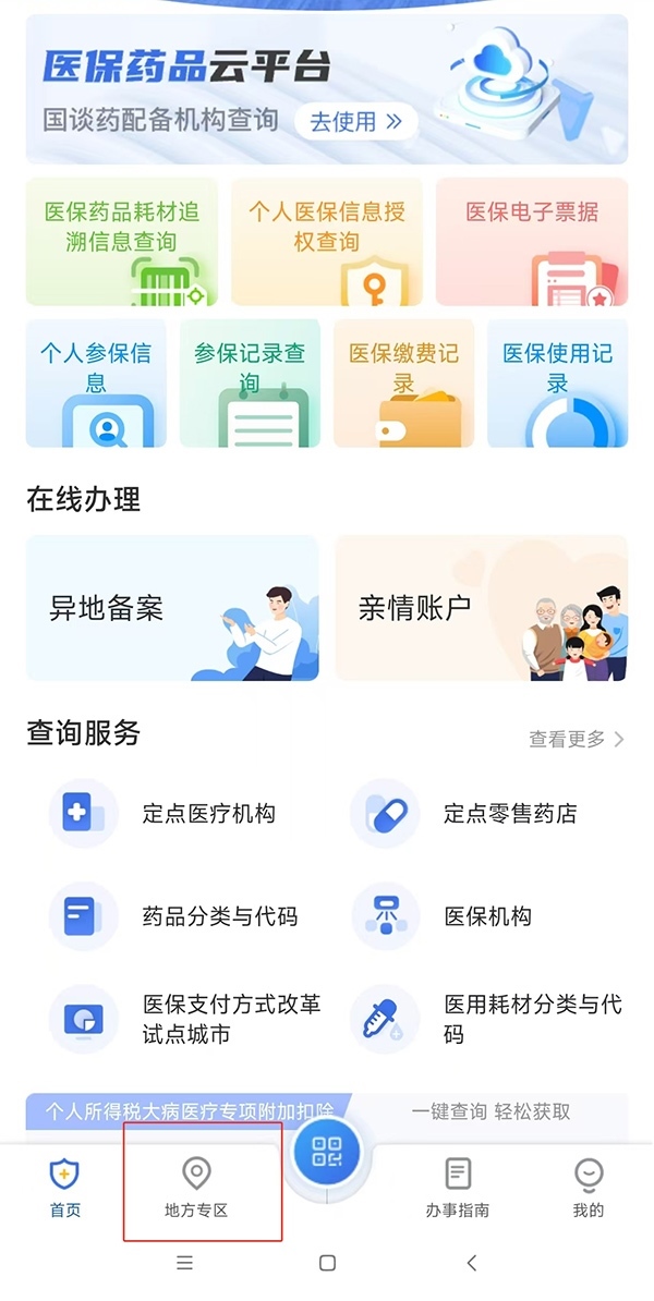 第一步:以北京為例,打開“國家醫(yī)保服務(wù)平臺”App,點擊進(jìn)入下方“地方專區(qū)”,選擇“北京市”。