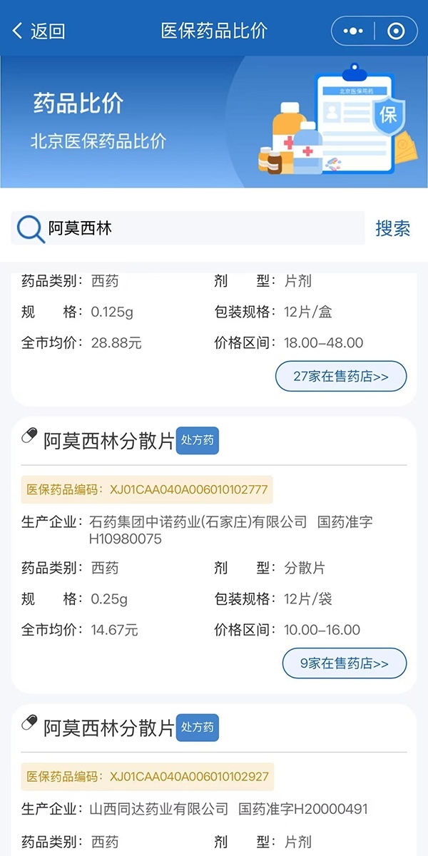 第四步:以搜索阿莫西林為例,可以看到下方展示了在售的相關(guān)商品及價格等信息。