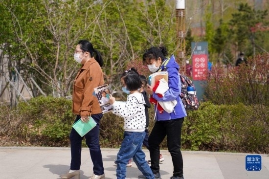 4月22日,市民在“換書大集”上挑選完圖書后準(zhǔn)備拿到圖書館閱讀。
