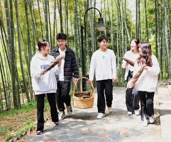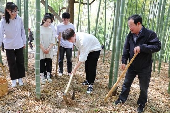 進(jìn)行40分鐘的“漫談式”課程后,師生們一起拿起鋤頭,開始挖筍實(shí)踐。在勞動中,他們感受著春天的饋贈。該校視覺傳達(dá)與設(shè)計專業(yè)的南通姑娘周雨濛從未嘗試過挖筍。對于校園中的竹子是何人養(yǎng)護(hù)、怎么養(yǎng)護(hù),她了解得不多。課堂上,她第一次拿起鋤頭,在學(xué)校校工的帶領(lǐng)下挖筍。