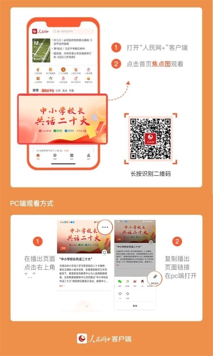 5月12日起,“人民網(wǎng)+”客戶端推出“中小學校長共話二十大”專題節(jié)目,每日11:00上新,圍繞黨的領導、鑄魂育人、教育改革、教育公平、強師興校等話題述成績、言感悟、談現(xiàn)狀、話未來,切實把黨的二十大精神轉化為辦學治校、教書育人的實際行動。讓我們一起傾聽全國百位中小學校長共話二十大,共同描繪教育事業(yè)發(fā)展的新藍圖。