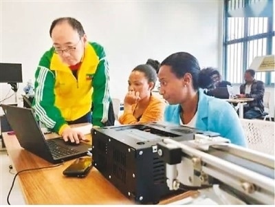 天津職業(yè)技術(shù)師范大學(xué)教師、埃塞魯班工坊中方負(fù)責(zé)人江絳(左一)在當(dāng)?shù)厥谡n。