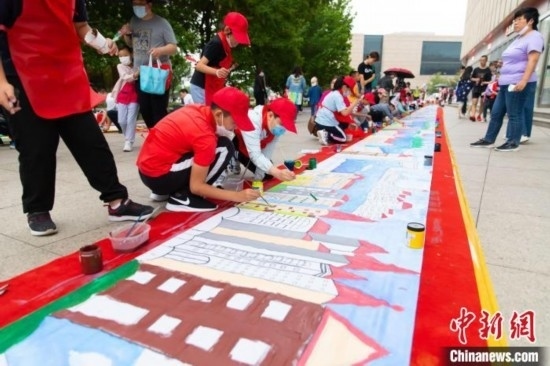圖為天津市少年兒童百米長(zhǎng)卷繪制活動(dòng)現(xiàn)場(chǎng)。王在御 攝