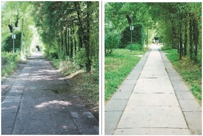 左圖:保護(hù)項目對燕南園水泥路修復(fù)前的景象。右圖:保護(hù)項目對燕南園水泥路進(jìn)行修復(fù)后的效果。燕南園保存下來的水泥路以“脫漿彩石混凝土”工藝進(jìn)行施工,老校友稱之為“洋灰路”。這里的“洋灰路”已有76年歷史,大部分仍能正常使用。北大建筑與景觀設(shè)計學(xué)院的李迪華老師發(fā)現(xiàn),燕南園東側(cè)水泥路破損后,顯露出大小和顏色都參差不齊的石子。于是,他開始追溯這些“洋灰路”的歷史價值,與北大“燕園公益營建社”的黃可同學(xué)翻閱北大檔案館資料,找到了歷史照片。又幾經(jīng)輾轉(zhuǎn),尋訪到了九旬高齡的老校友。研究發(fā)現(xiàn),燕園中最早的水泥路修建于1948年。為此,李迪華大力呼吁保護(hù)這些水泥路,尋訪到專門修復(fù)歷史路面的施工團(tuán)隊,對少量保存完整的路面進(jìn)行修復(fù);破損的洋灰原料則被回收,取出原骨料,采用相同的工藝進(jìn)行還原。不僅老材料得到循環(huán)利用,歷史道路的價值也“凝固”在更新后的路面中。