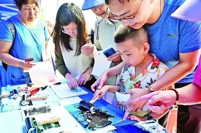 4月24日是“中國航天日”,海南文昌舉辦“氣象航天手牽手”系列科普活動,用各種趣味實(shí)驗(yàn)和游戲讓觀眾了解航天知識。圖為小朋友和家長在文昌航天科普中心制作航天主題版畫。新華社記者 郭程攝